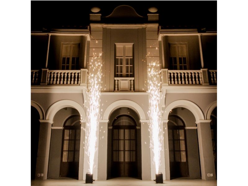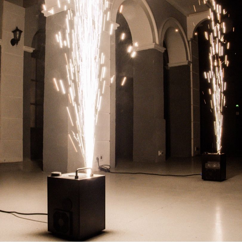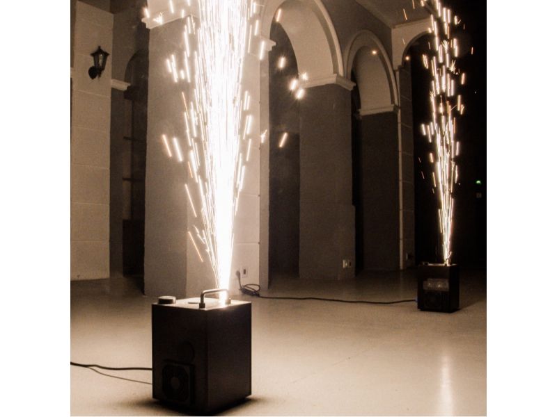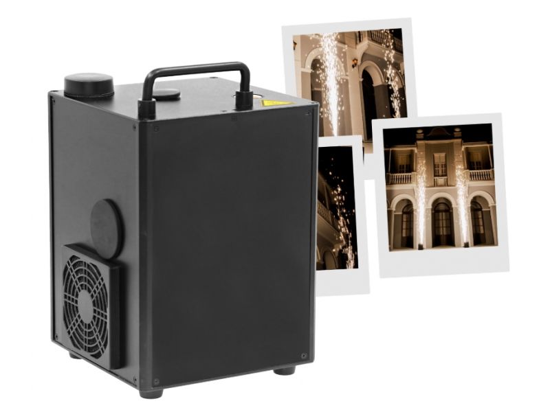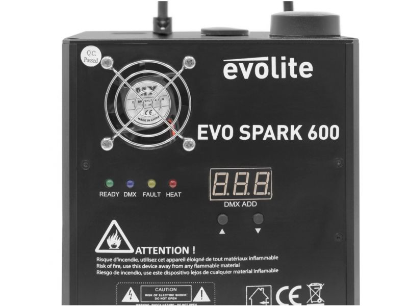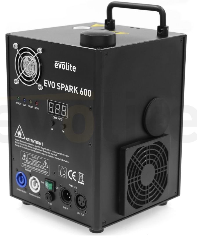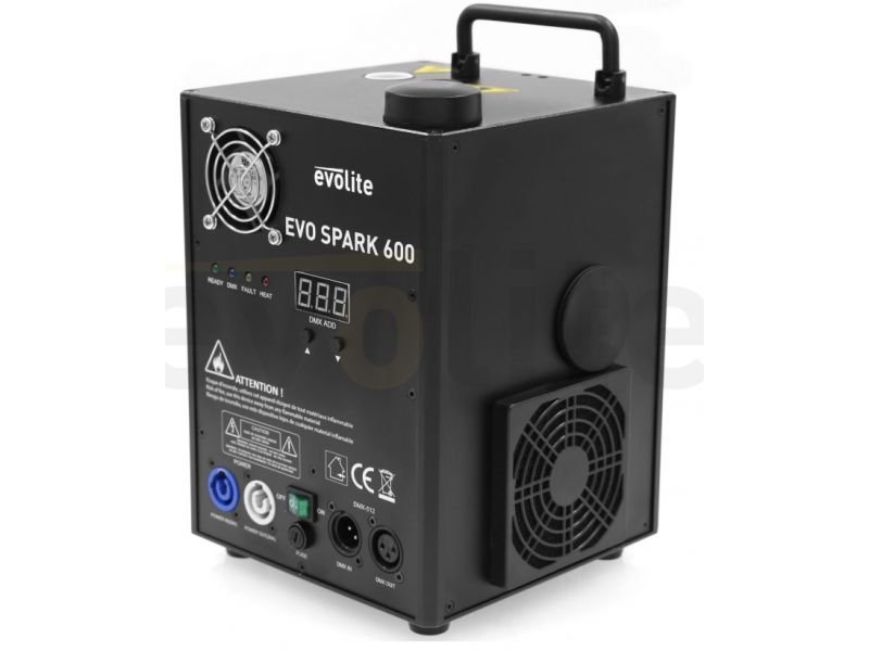 Spark machine with spark height adjustment from 1 to approx. 6 m. Professional spark machine The Evo Spark 600 is not a machine using pyrotechnics (chemical combustion). This machine uses a metallic powder (titanium) heated electrically, without c...