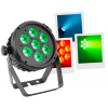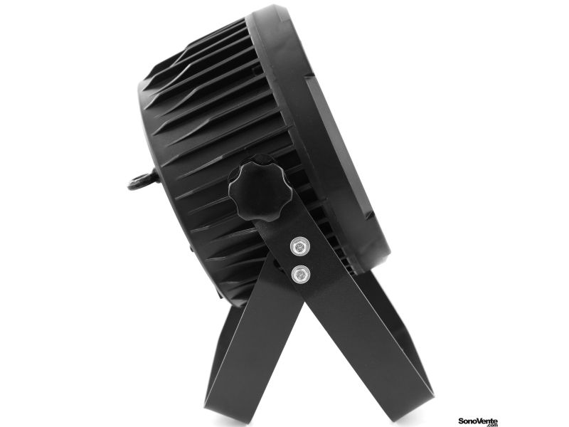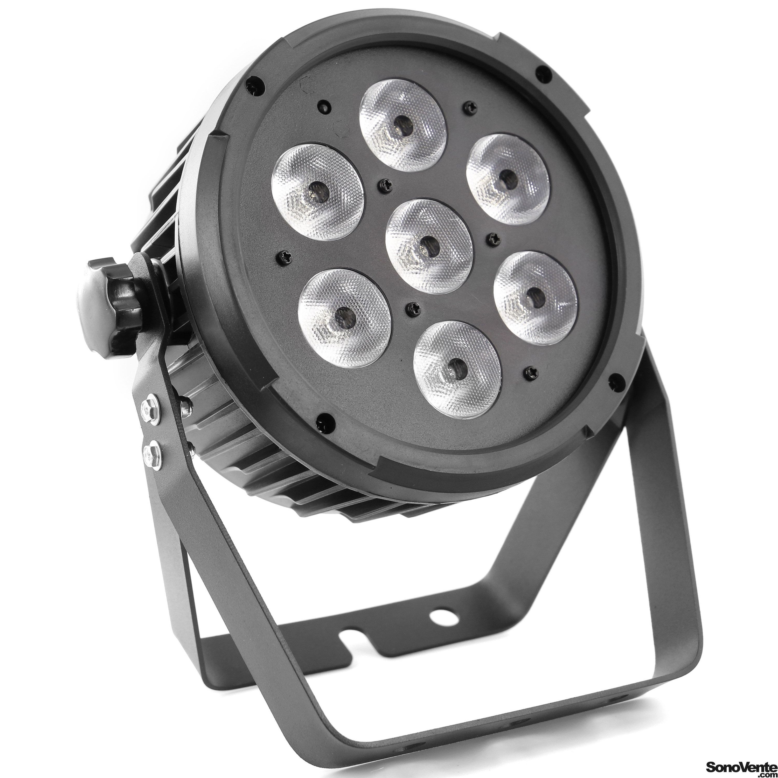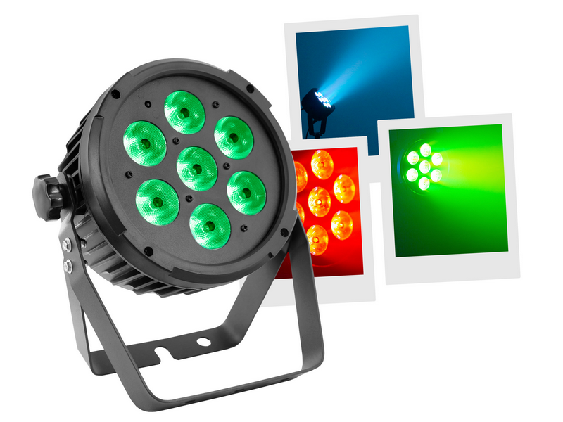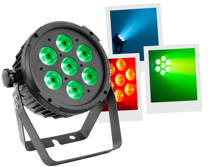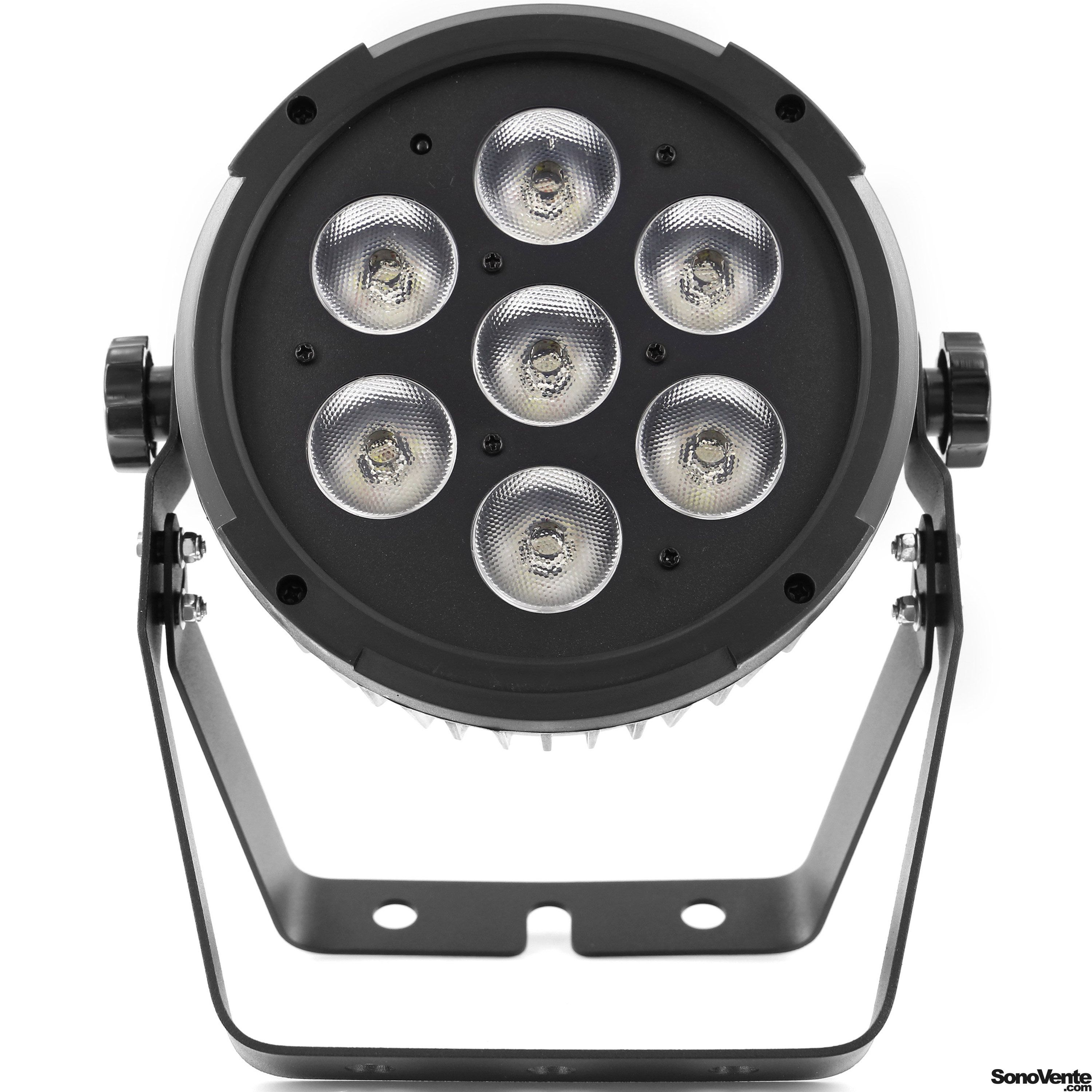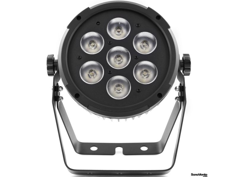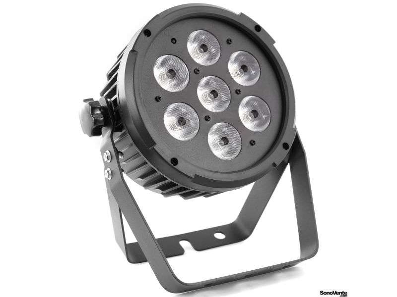 Flat led par with 7pieces 12W 6 in 1 RGBWA-UV leds and remote control. Led parlight Projection angle 25 ° Controllable in DMX, Auto, Music, Master / slave, IR remote control Plastic case Link possible by female IEC power cable Double mounting or f...