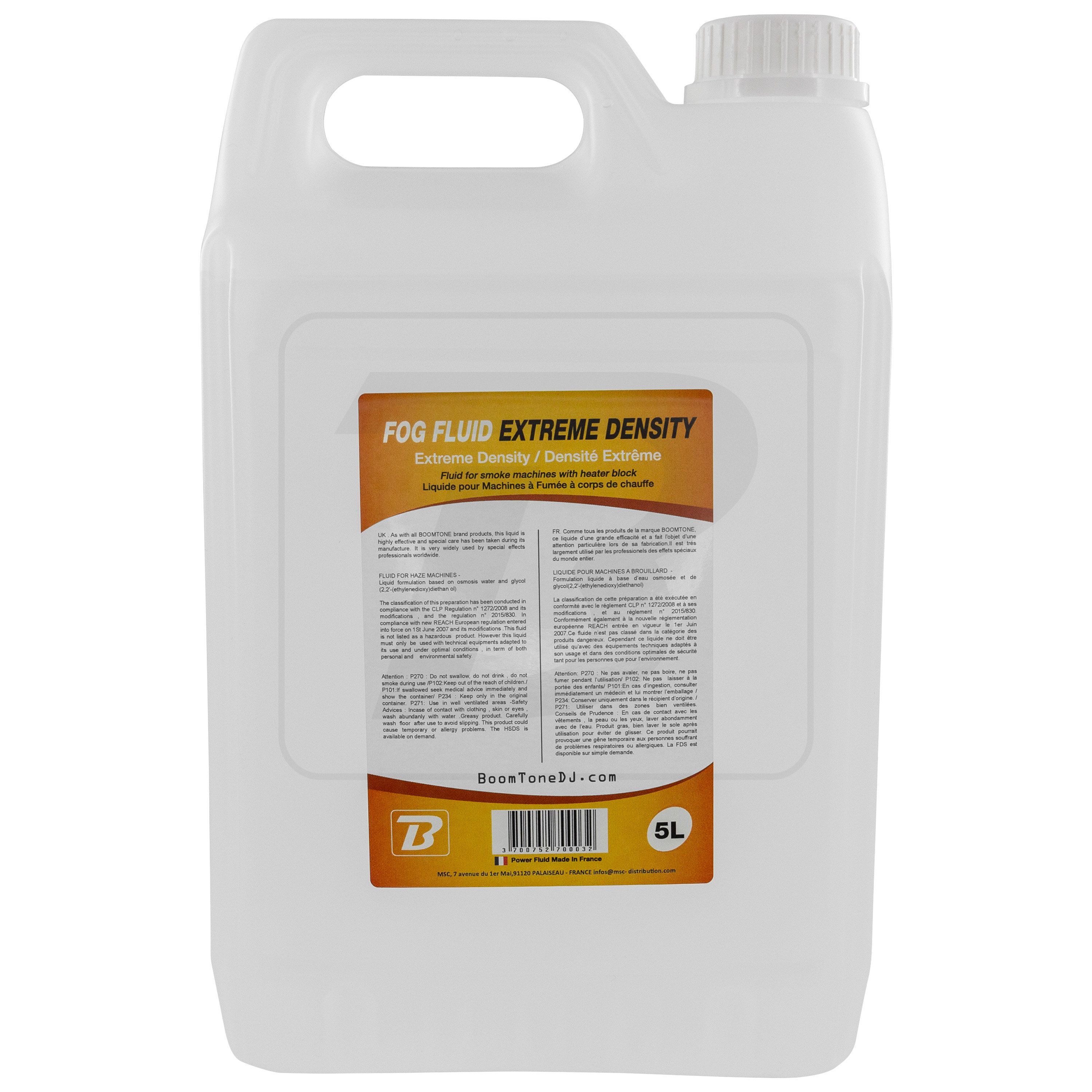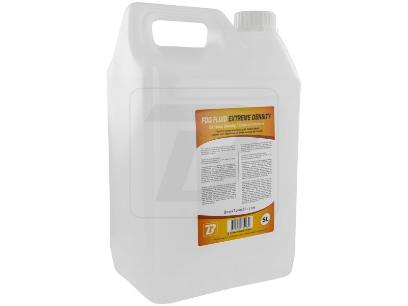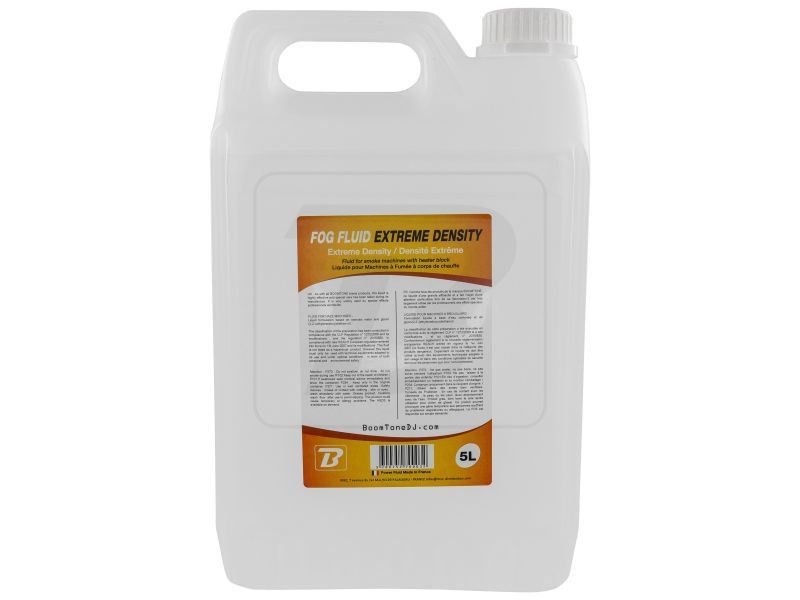 BoomToneDJ Extreme Density Fog Fluid 5L Bottle of liquid for very dense smoke machine Format 5 liters High chemical purity Produces a dense white smoke and very Ideal for all smoke machines BoomToneDJ Complies with CE and NF Recyclable B...