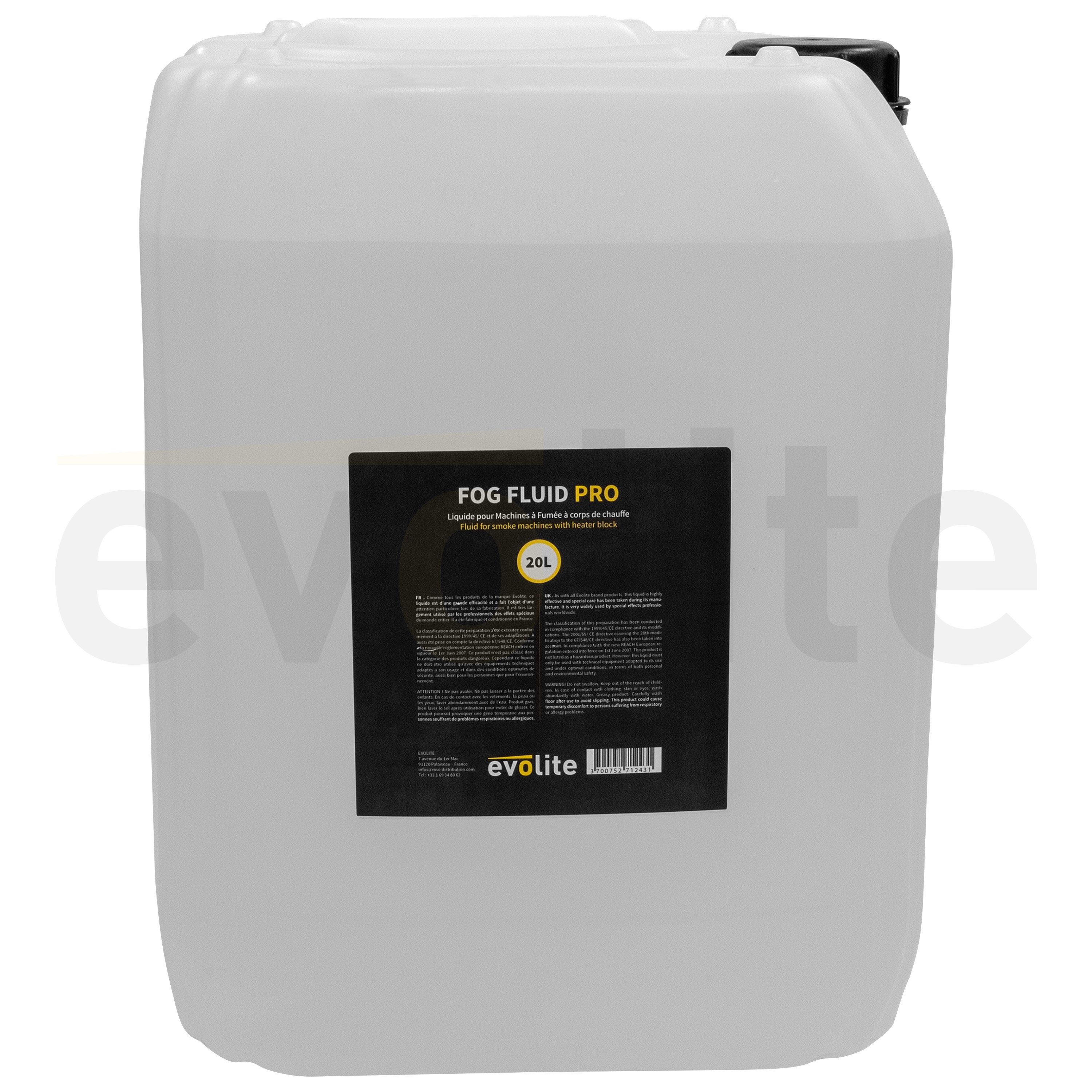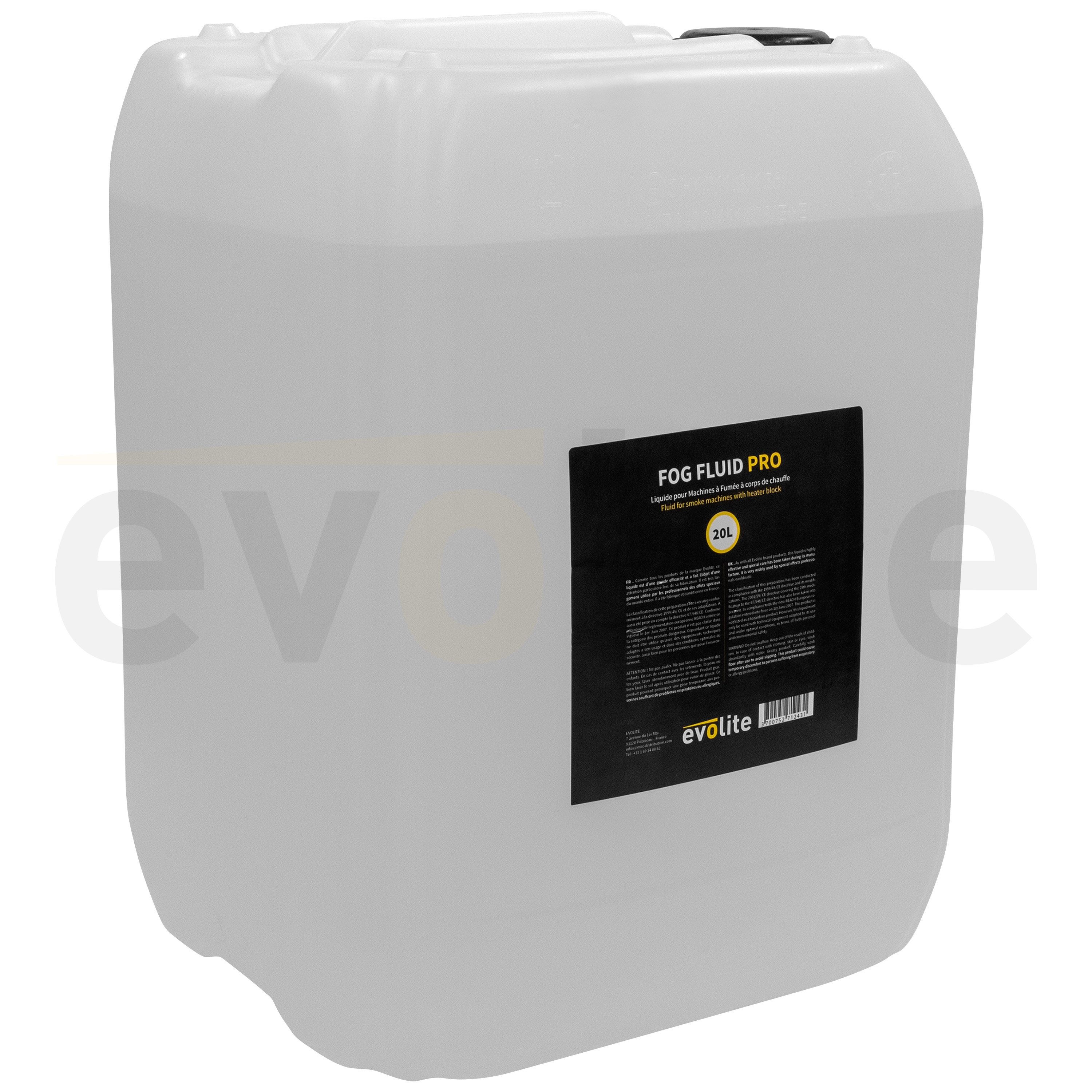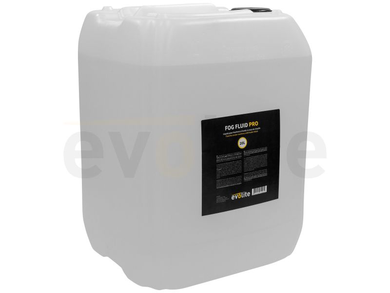 20L canister of liquid for smoke machine, in compliance with CE and NF standards, Evolite Fog Fluid Pro 20L Evolite Fog Fluid Pro 20L Liquid container for smoke machine Format 20 litres High chemical purity Produces a very white smoke Idea...
