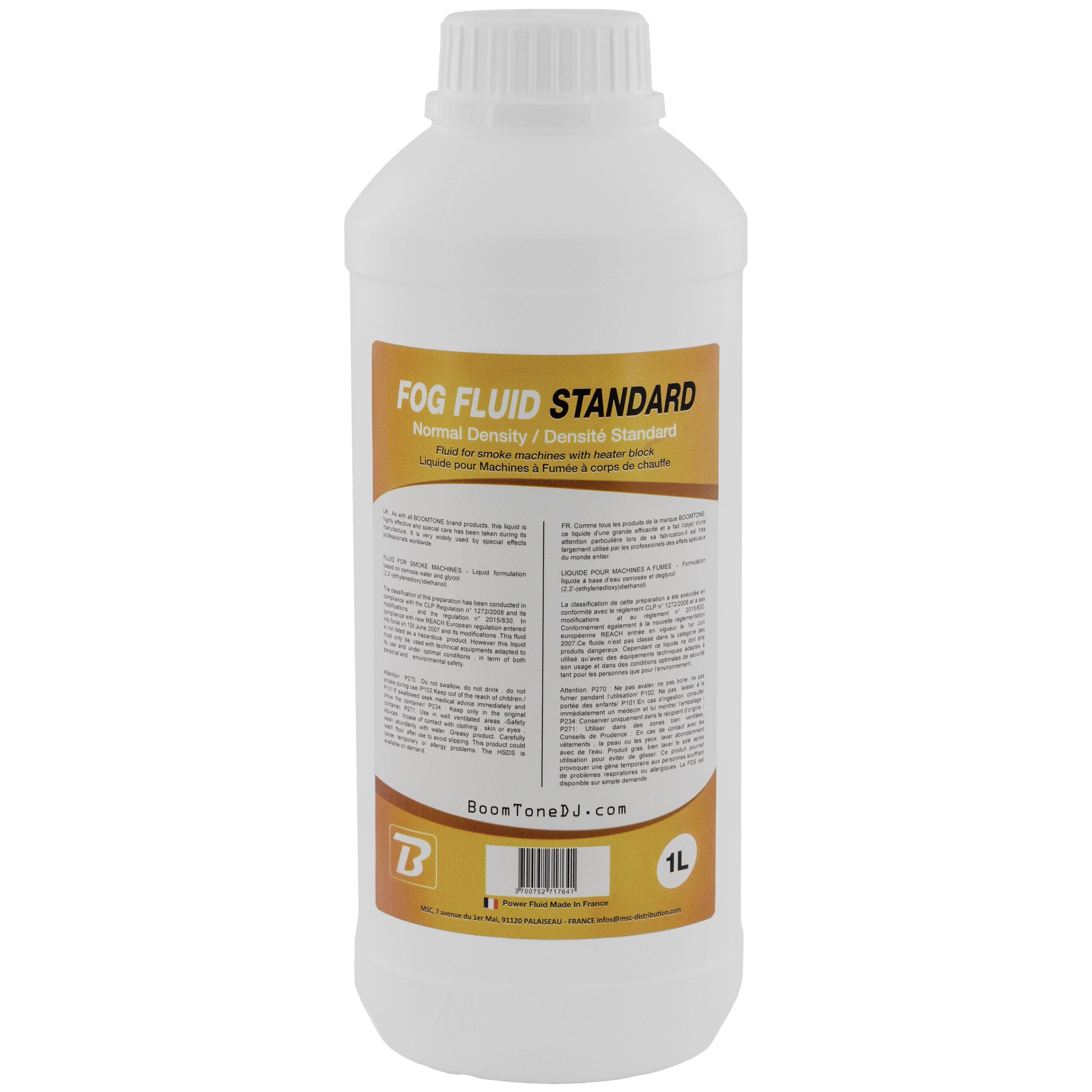 BoomToneDJ Fog Fluid Standard 1 L is a liquid specially formulated to produce a light, white, well diffused fog, ideal for enhancing lighting effects while maintaining comfortable visibility in the room. Thanks to its high chemical purity, this fluid guarantees a residue- and deposit-free emission, keeping your fog machine clean and long-lasting. Compatible with all water-based fog machines, this fluid is perfectly suited to the needs of mobile DJs, concert halls, events or fixed installations. It offers excellent visual rendition without excessive saturation, making it a safe choice for a controlled, professional atmosphere. Fog Fluid Standard is manufactured in France in compliance with NF and CE standards, ensuring consistent quality and compliance with current safety requirements. Presented in a practical 1 litre can weighing 1.1 kg, it is easy to transport and store, whether for occasional or regular use. Whether you're looking to create an enveloping atmosphere or enhance your lighting, this fluid is a reliable and versatile choice.