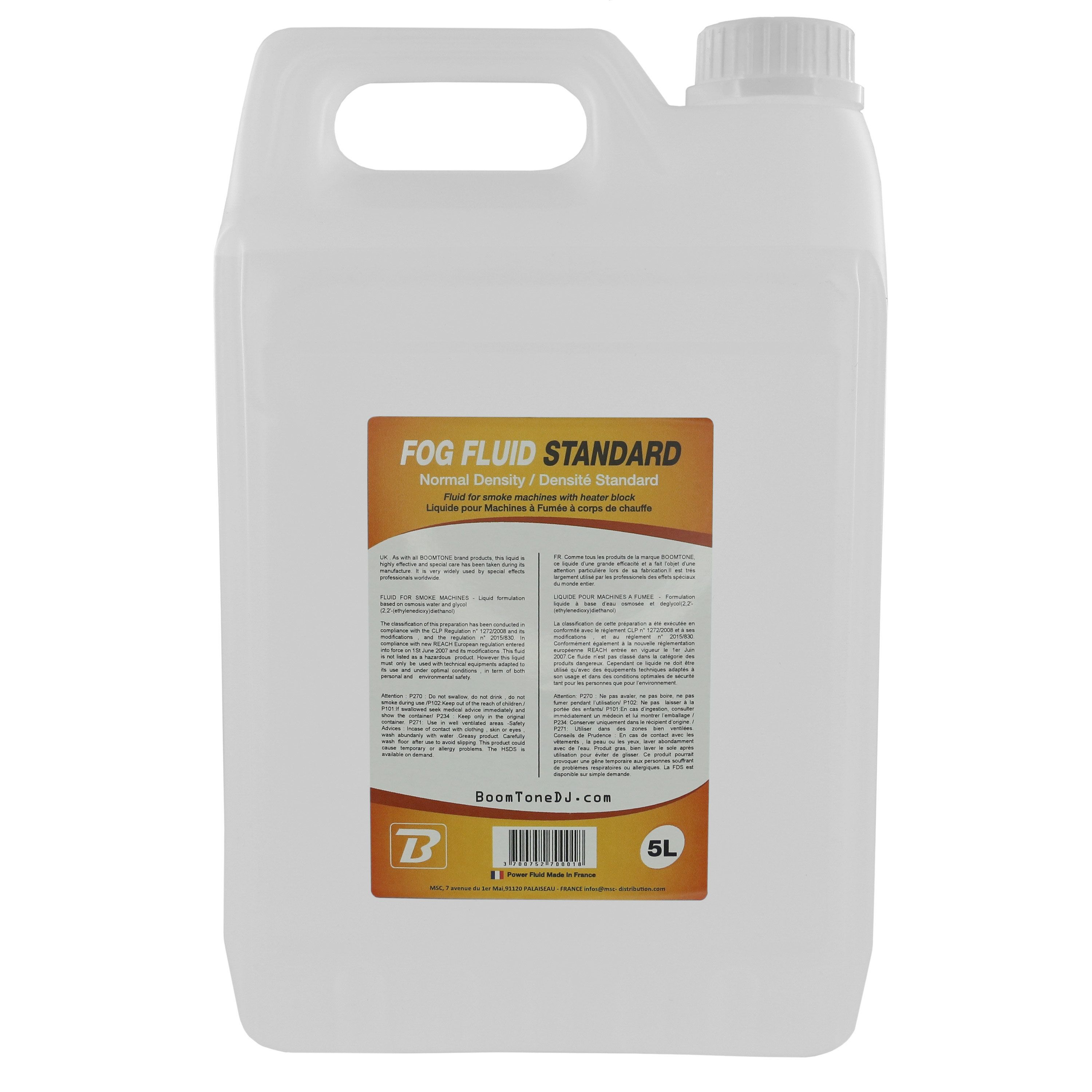 5L container of standard fluid for smoke machine, complies with CE and NF standards, BoomToneDJ Fog Fluid Standard 5L BoomToneDJ Fog Fluid Standard 5L Standard fluid container for smoke machine 5L format High chemical purity Produces a light...