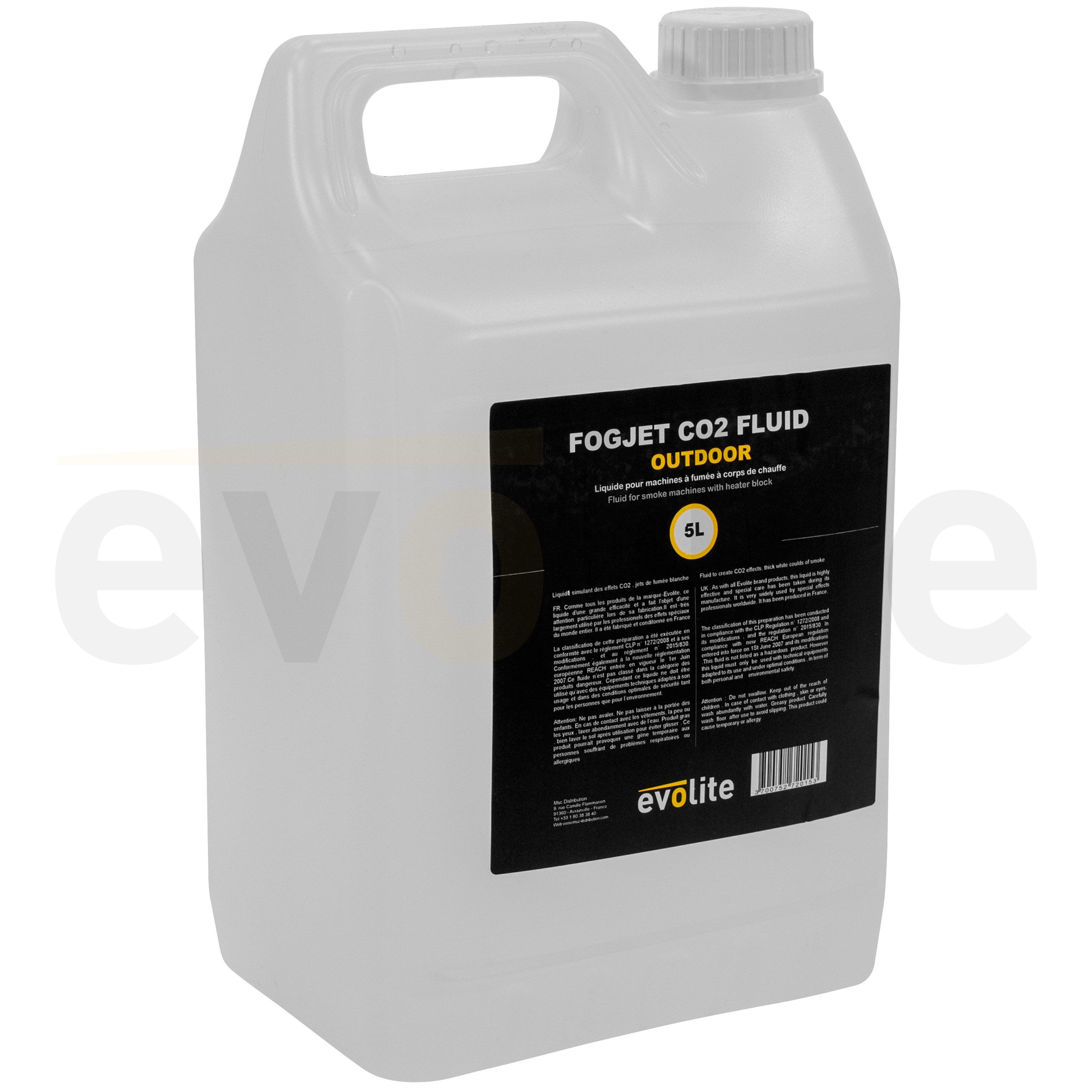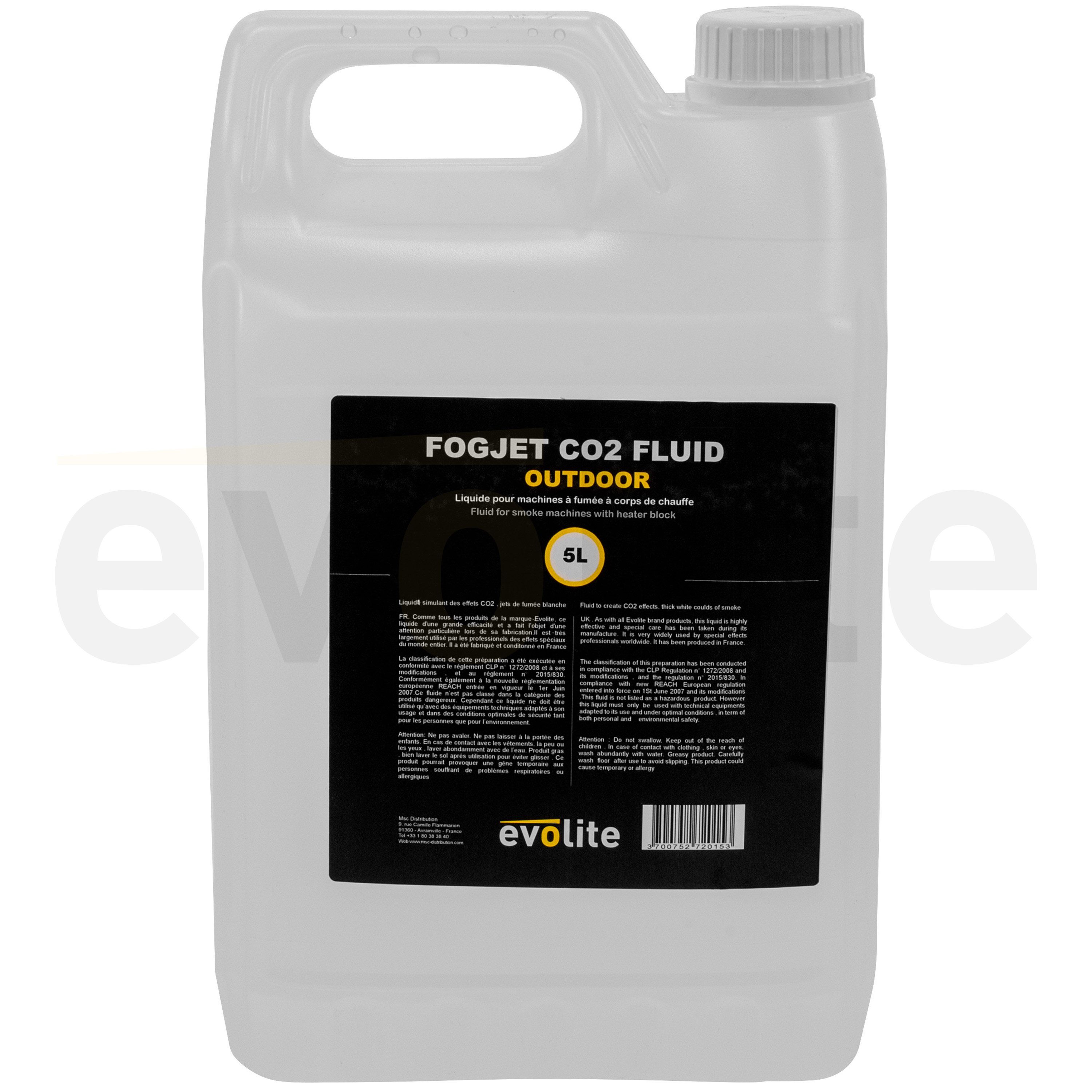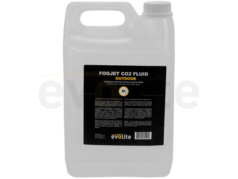 Evolite FogJet Co2 Fluid Outdoor 5L - Professional fluid for Co2 machines. Fast-evaporating opaque white smoke, made in France and NF/CE certified, ideal for outdoor events.