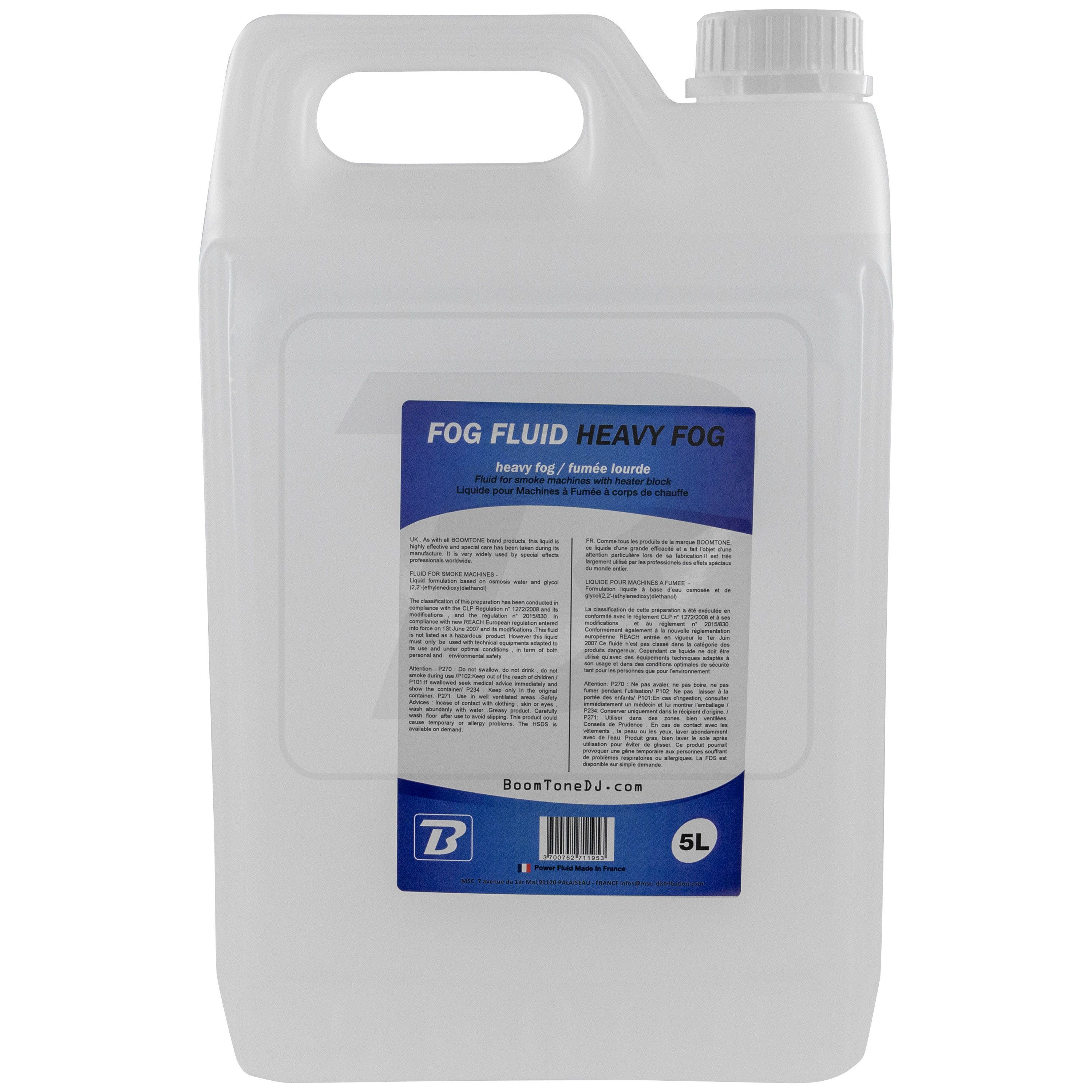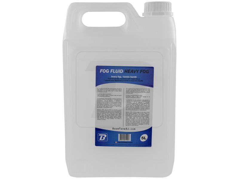 BoomToneDJ Heavy Fog Fluid 5L Liquid can for heavy smoke machine Format 5 liters High chemical purity Produces a very white smoke Ideal for all heavy smoke machines Meets the NF standards and CE Recyclable bottle Made in France