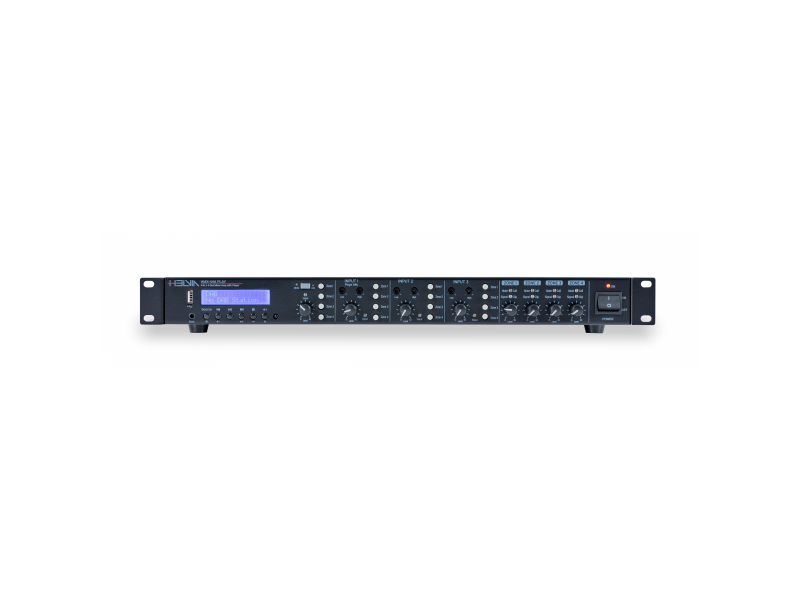 HMX-44A je univerzálne „all-in-one“ riešenie pre ozvučenie menších a stredných priestorov. V jedinom zariadení (1U rack) kombinuje metrixový prepínač, mixážny pult, multimediálny prehrávač a štyri nezávislé zosilňovače.