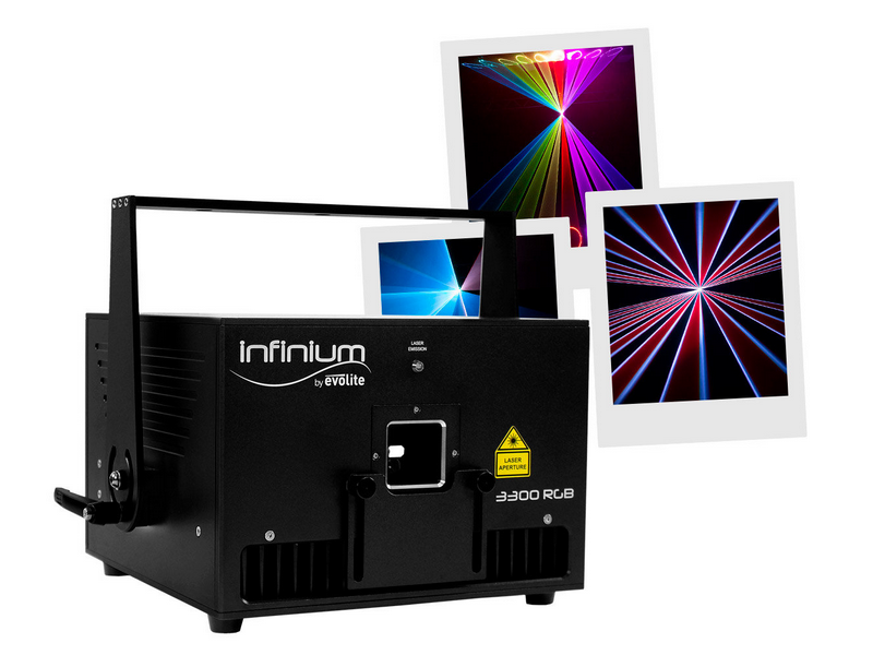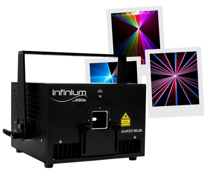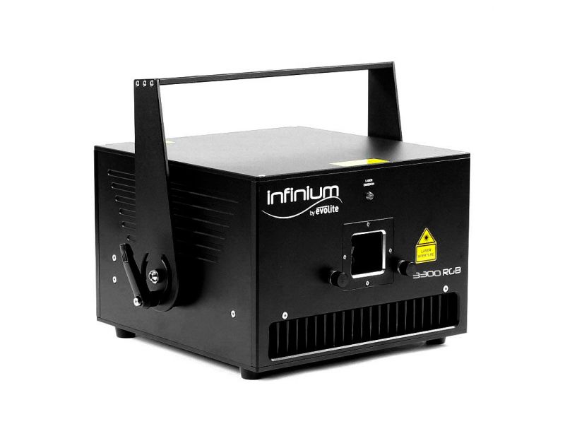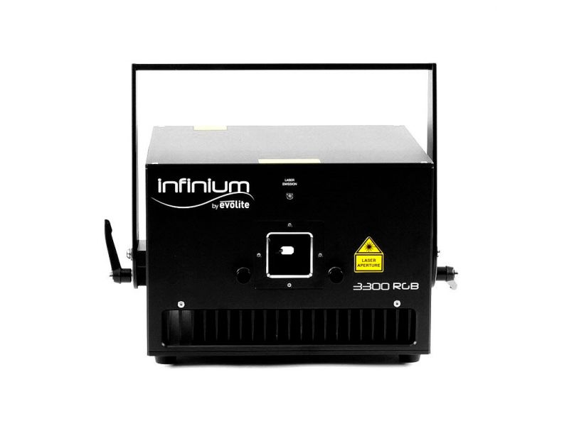 EVOLITE Infinium 3300 RGB A total guaranteed output power of 3040mW Analog modulation Class 4 Safety key Scan Fail Safety system that automatically turns off the light of the LASER in case of a failure of mirrors scans 35 kpps @8°ultra#fas...
