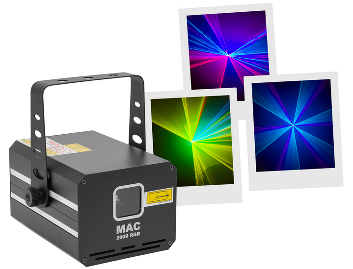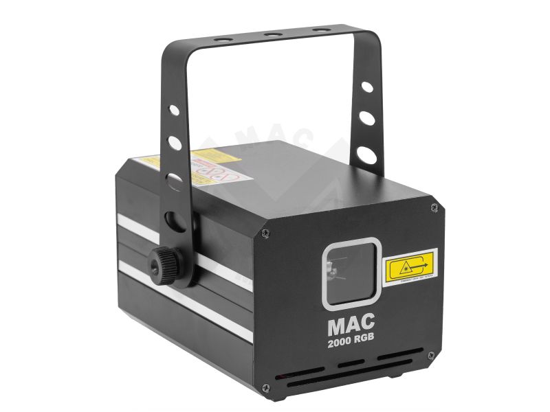 2,000 mW RGB colour animation LASER, automatic, DMX and musical modes. Mac Mah MAC 2000 RGB Class 4 Protection key Aluminium housing ILDA input and output interface 3 mm diameter LASER beam Scan Fail Safety'' system automatically switche...