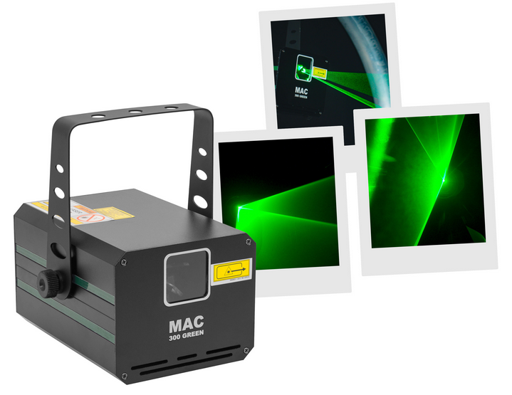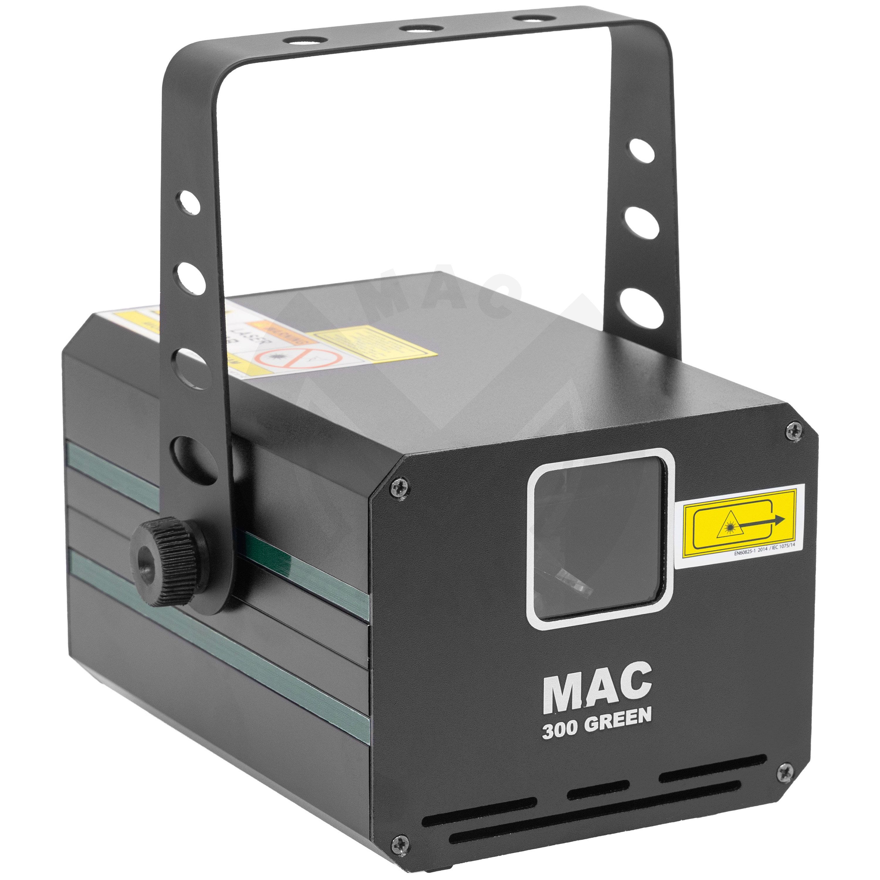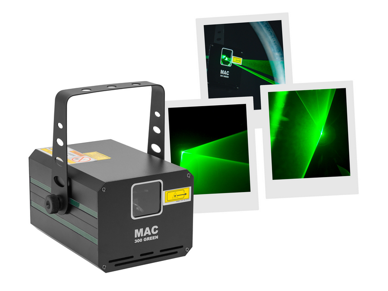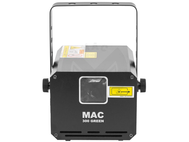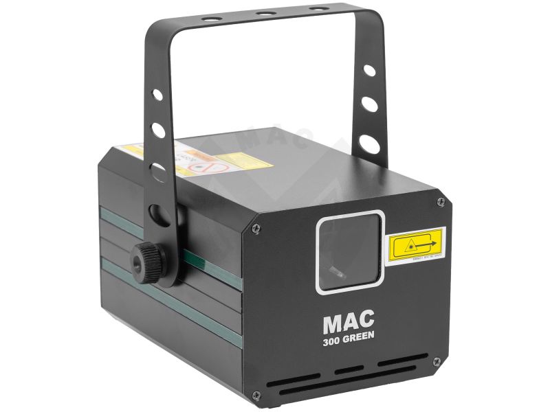300mW green animation LASER, automatic, DMX and musical modes. Mac Mah MAC 300 Green Class 3B Protective key Aluminium casing 3 mm diameter LASER beam Scan Fail Safety'' system automatically switches off the LASER in the event of a fault i...