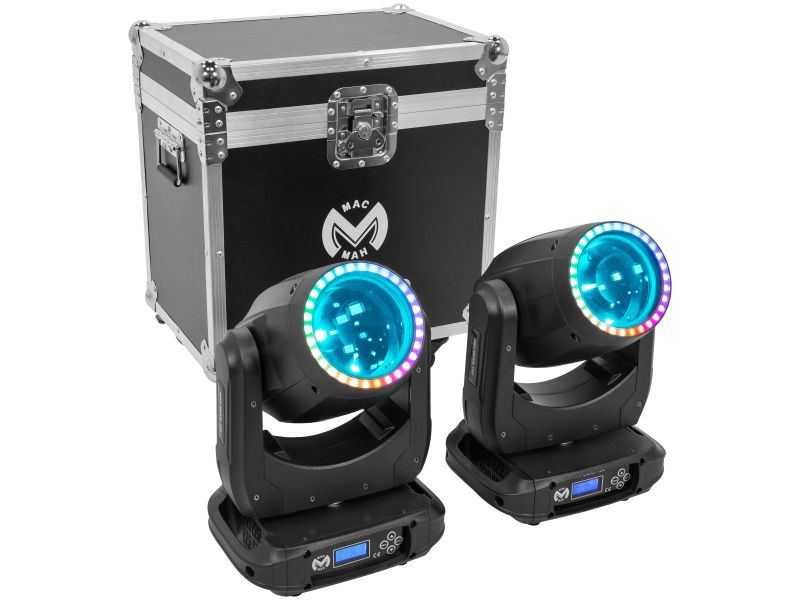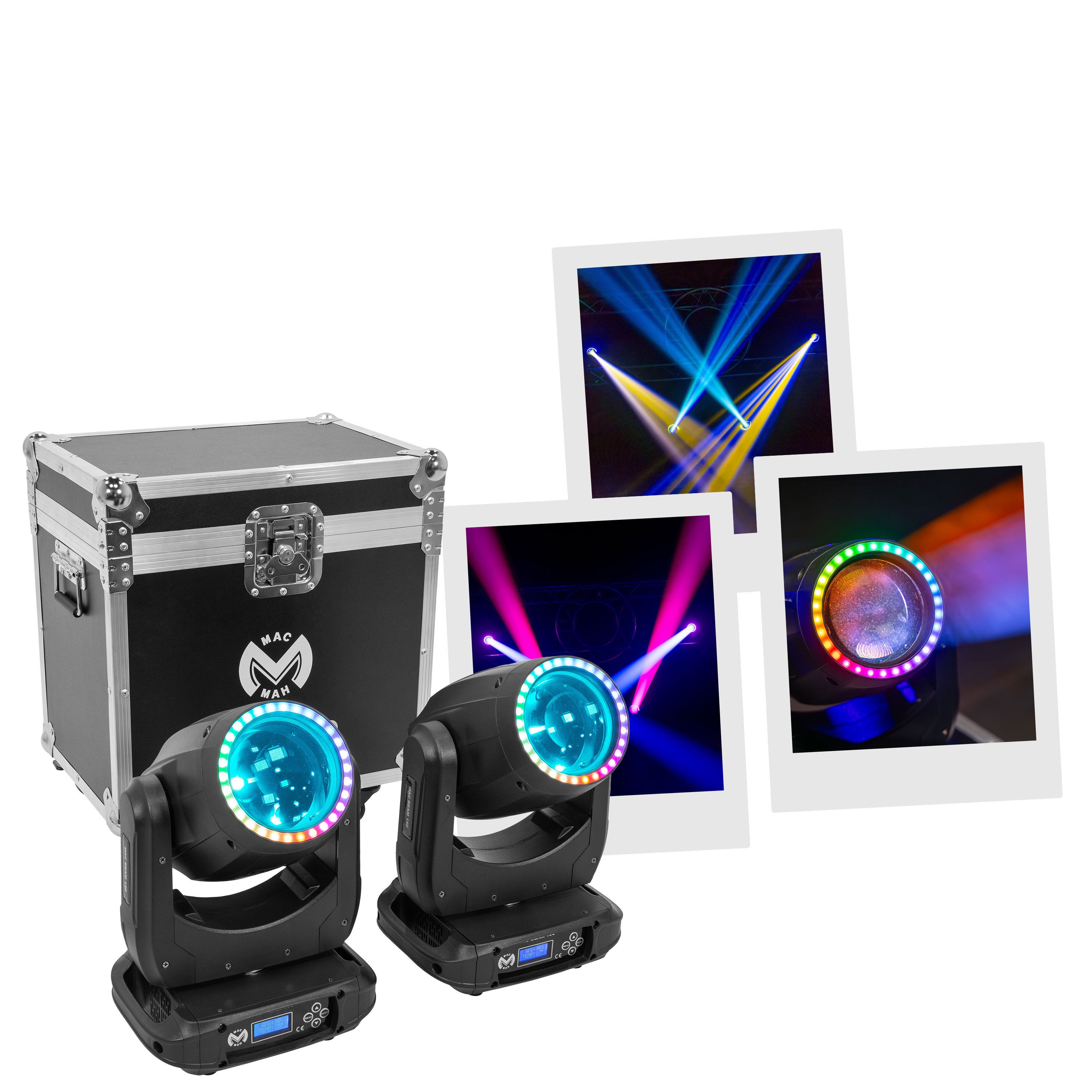 Set of 2 Mac Beam 150 LED lights with flight case. Powerful luminous flux, varied effects and DMX control for professional applications. Mac Mah Mac Beam 150 Set Pair of Beam 150 W 9,500 K white LED 30x 0.2 W SMD LEDs for halo effect 16 DMX...