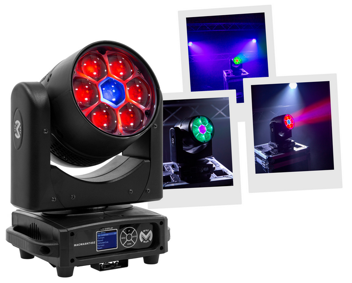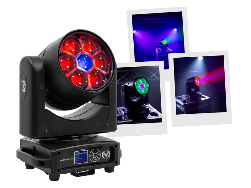 Mac Mah Mac Wash 740Z RGBW LED moving head for applications such as shows, events as well as art installations. Mac Mah Mac Wash 740Z Wash type LED moving head with Zoom 7 40W RGBW LEDs (4#in#1) 17 or 45 DMX channels PAN movements of 540° and TILT...