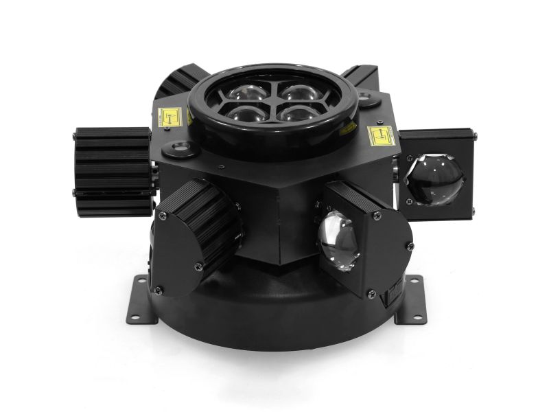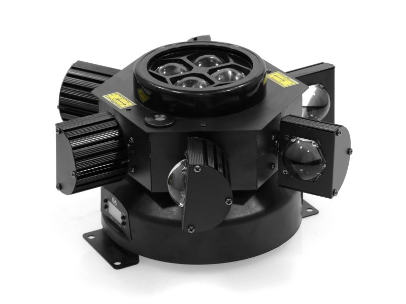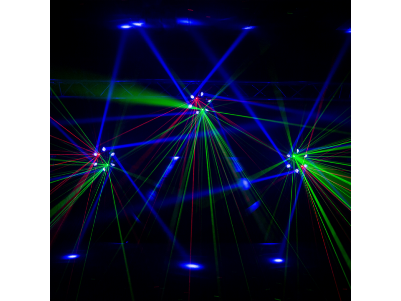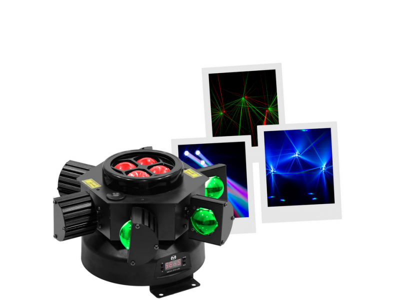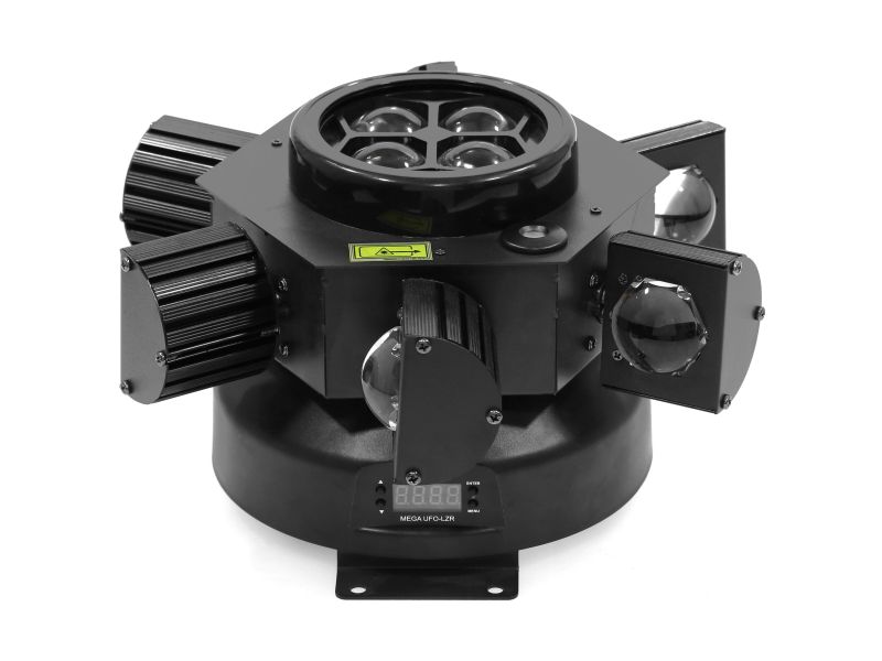 Mac Mah Mega UFO-LZR. 3-in-1 LED light show.Motorized and rotating multi#colored beams Beam red, green, blue and whiteHoneycomb effect ''Bee''The red and green LASER produce hundreds of beams22 DMX channels