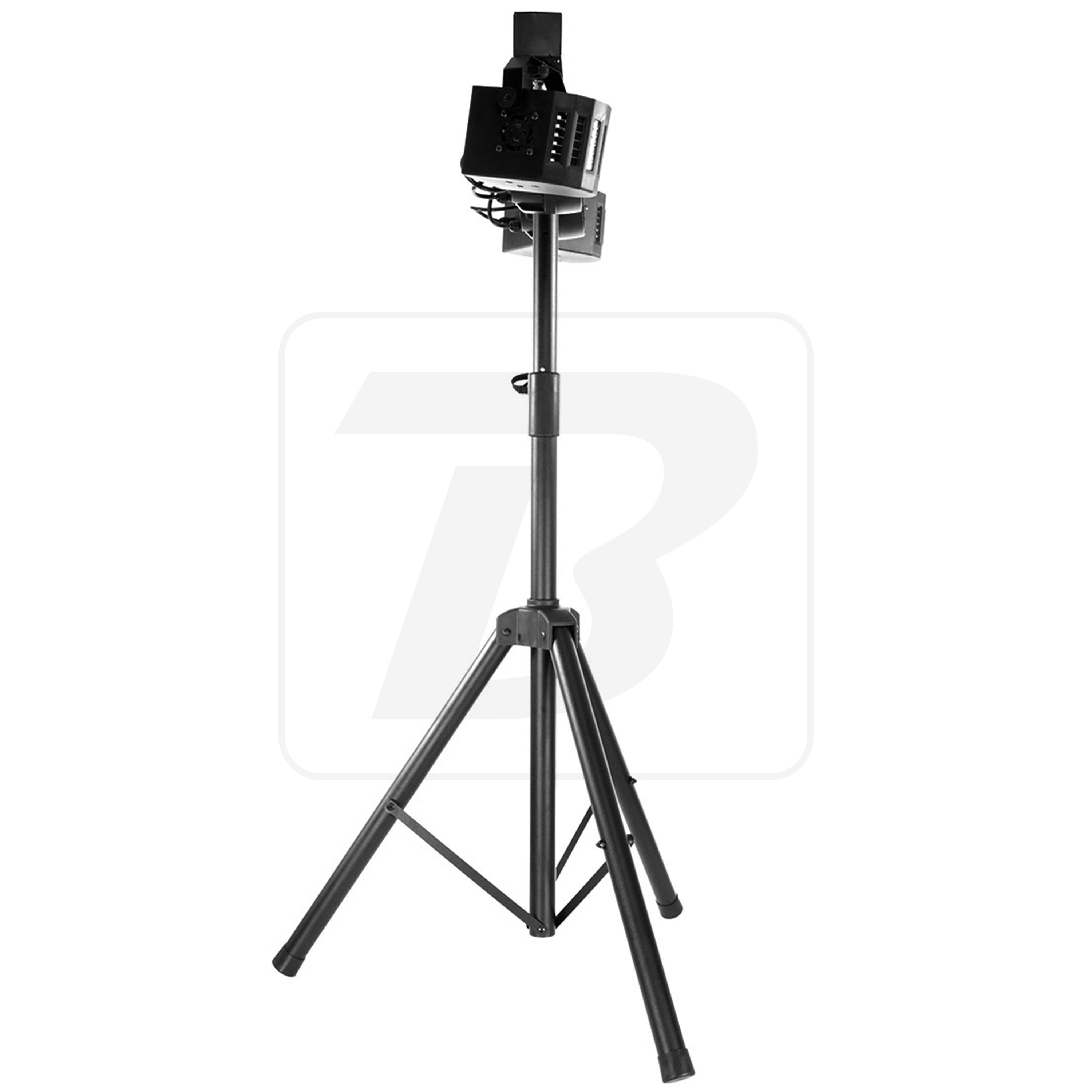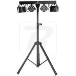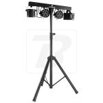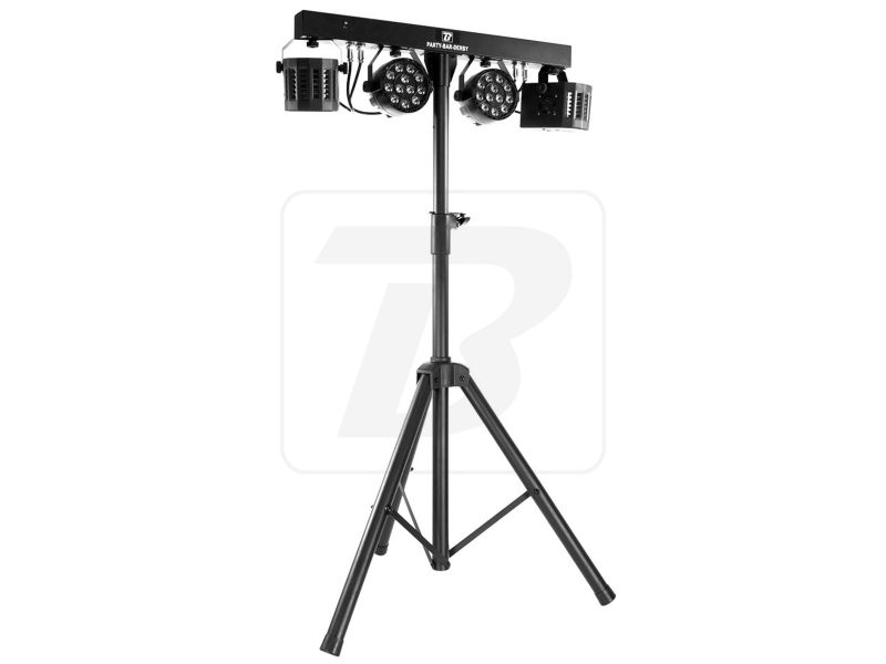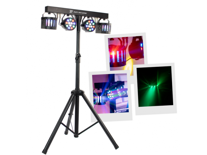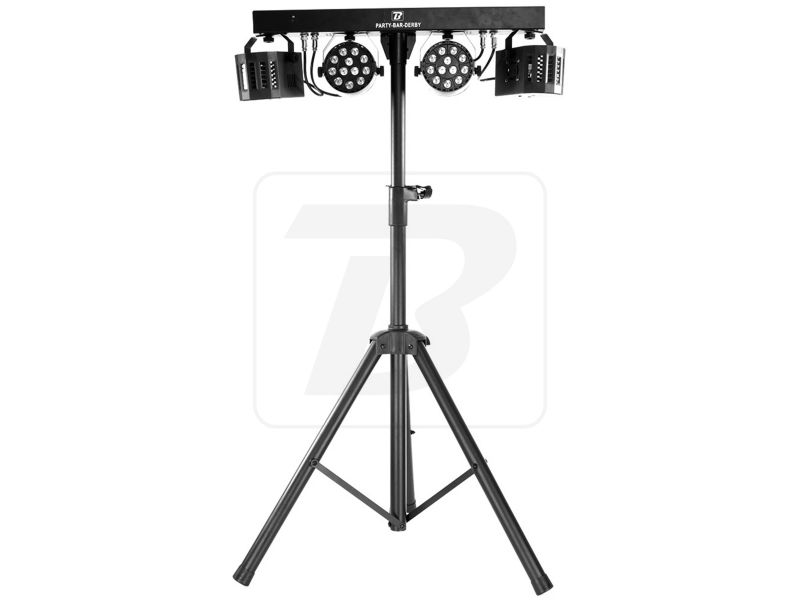 BoomToneDJ Party Bar Derby Set consisting of 2 LED spotlights and 2 Nano Derby fixed on a horizontal bar and a tripod Each spot is composed of 9 RGBW LEDs of 1W each The Nano Derby are equipped with 4 3W RGBW LED Many automatic programs for gr...