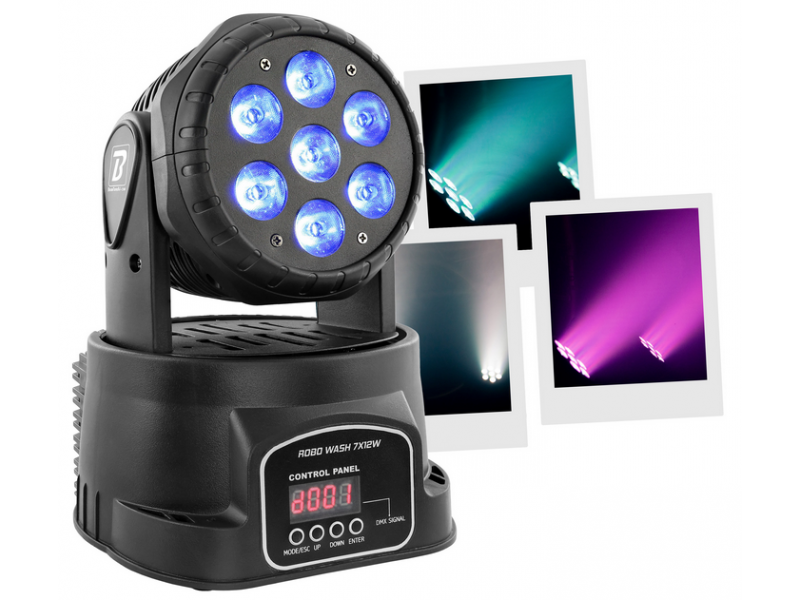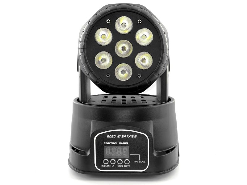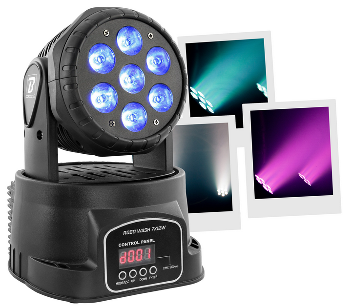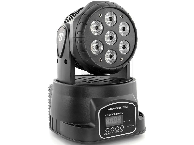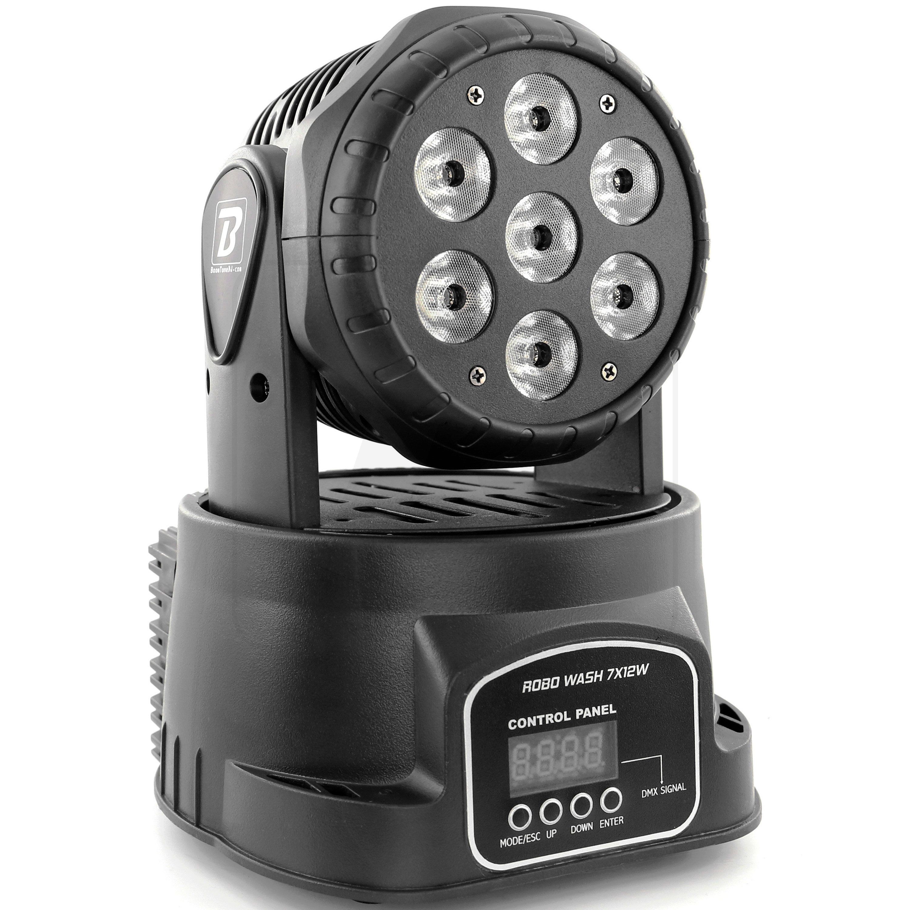 BoomtoneDJ ROBO WASH 7X12W Motorized Moving Head 7 RGBW LED 4-in-1. Boomtone DJ ROBO WASH 7X12W 7 x 12W 4#in#1 Red Green Blue White LEDs Homogeneous color mixing Dimmer and strobe functions Pan/Tilt movements Hooked by omega clip (2 screws...