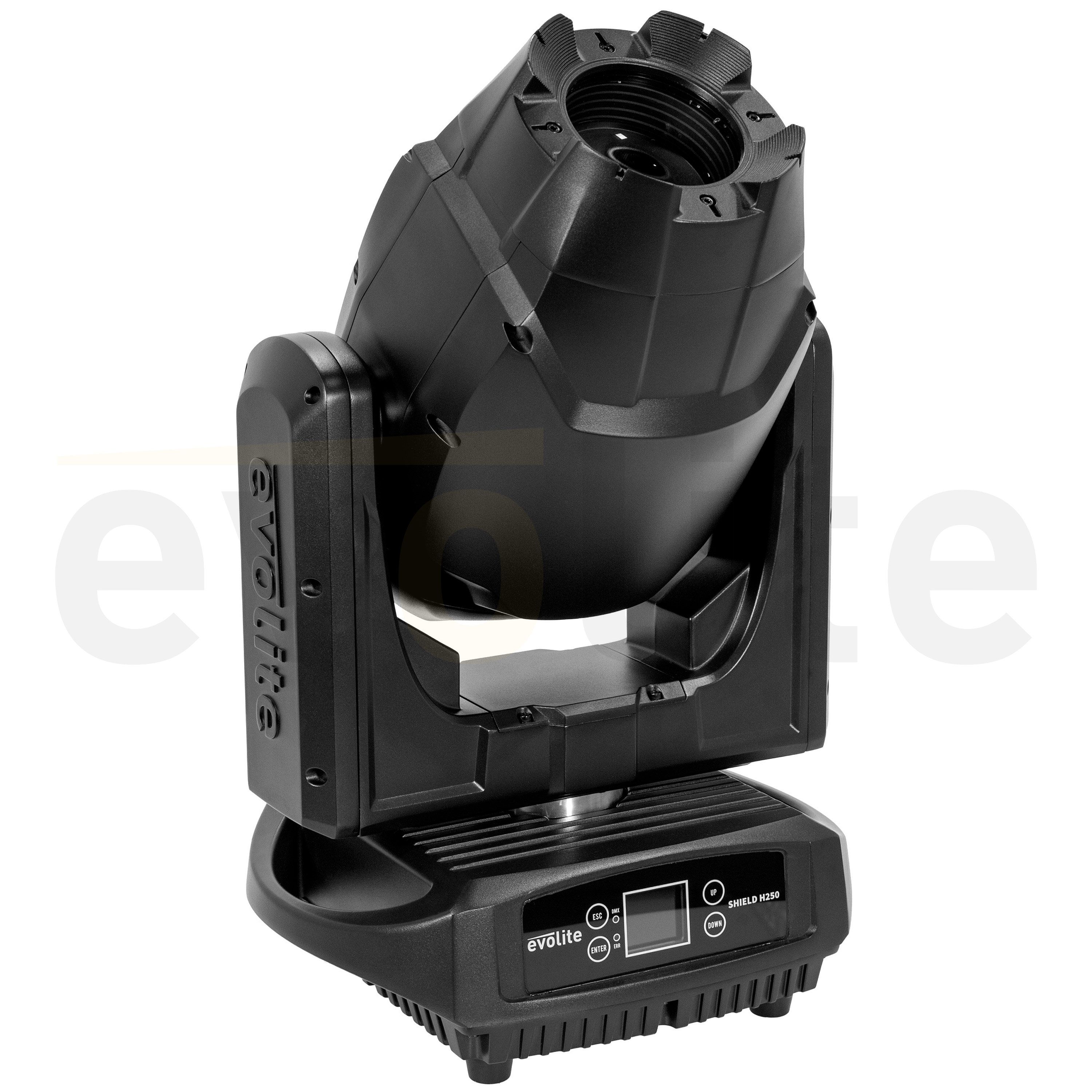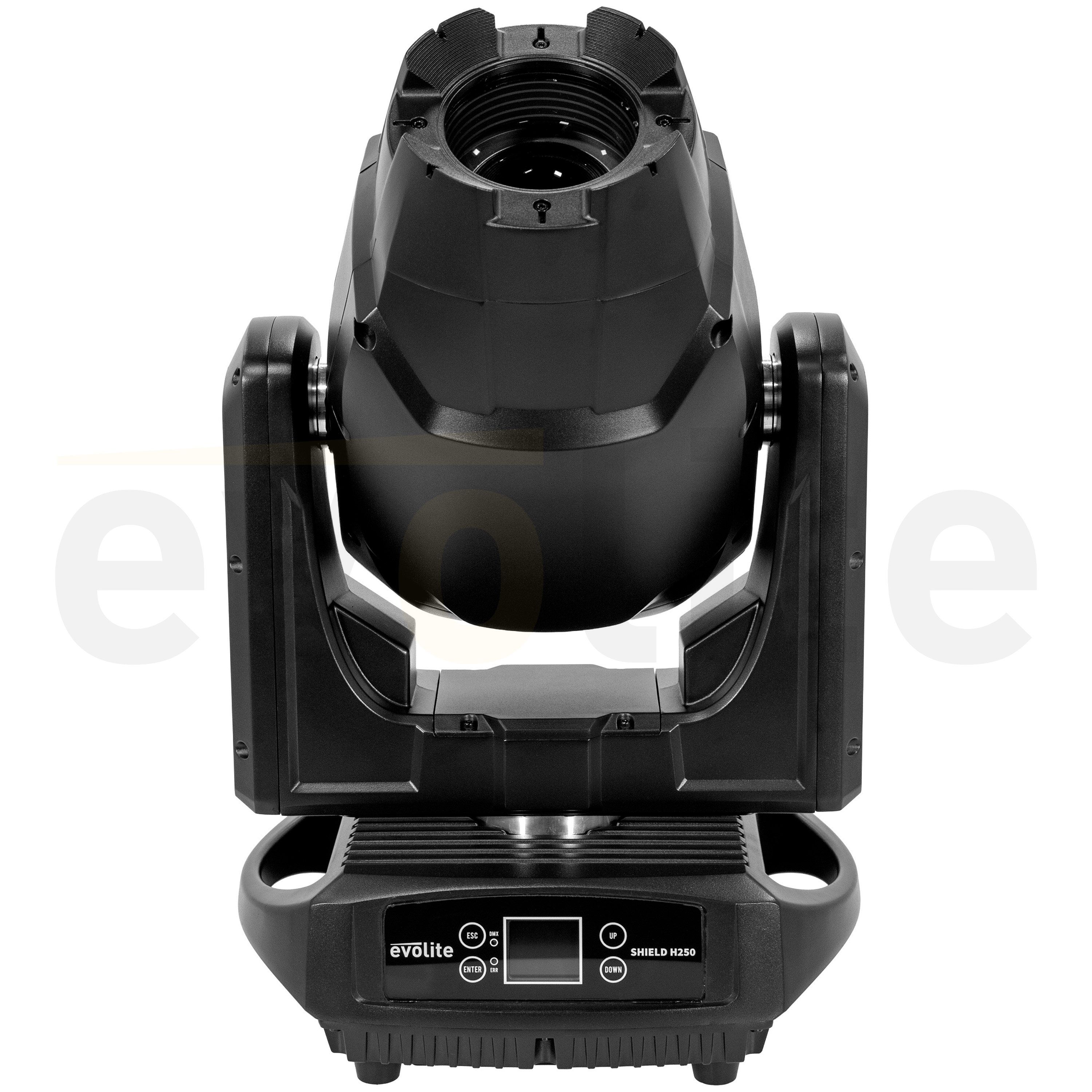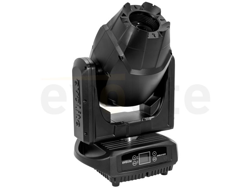 Evolite Shield H250 LED floodlight, 250 W, 4°-40° zoom, fixed/rotating gobos, IP65, DMX/auto/sound control. Perfect for indoor or outdoor events. evolite Shield H250 3#in#1 hybrid head 250 W # 8000 K white LED RDM function Wheel of 7 colours...