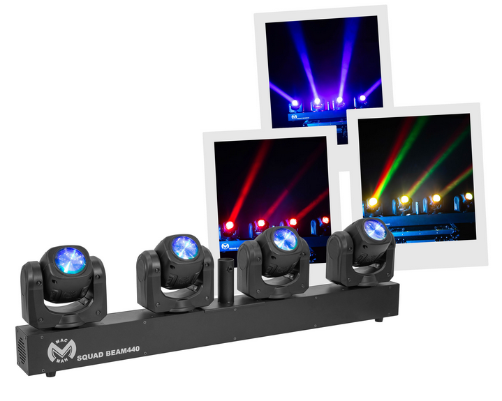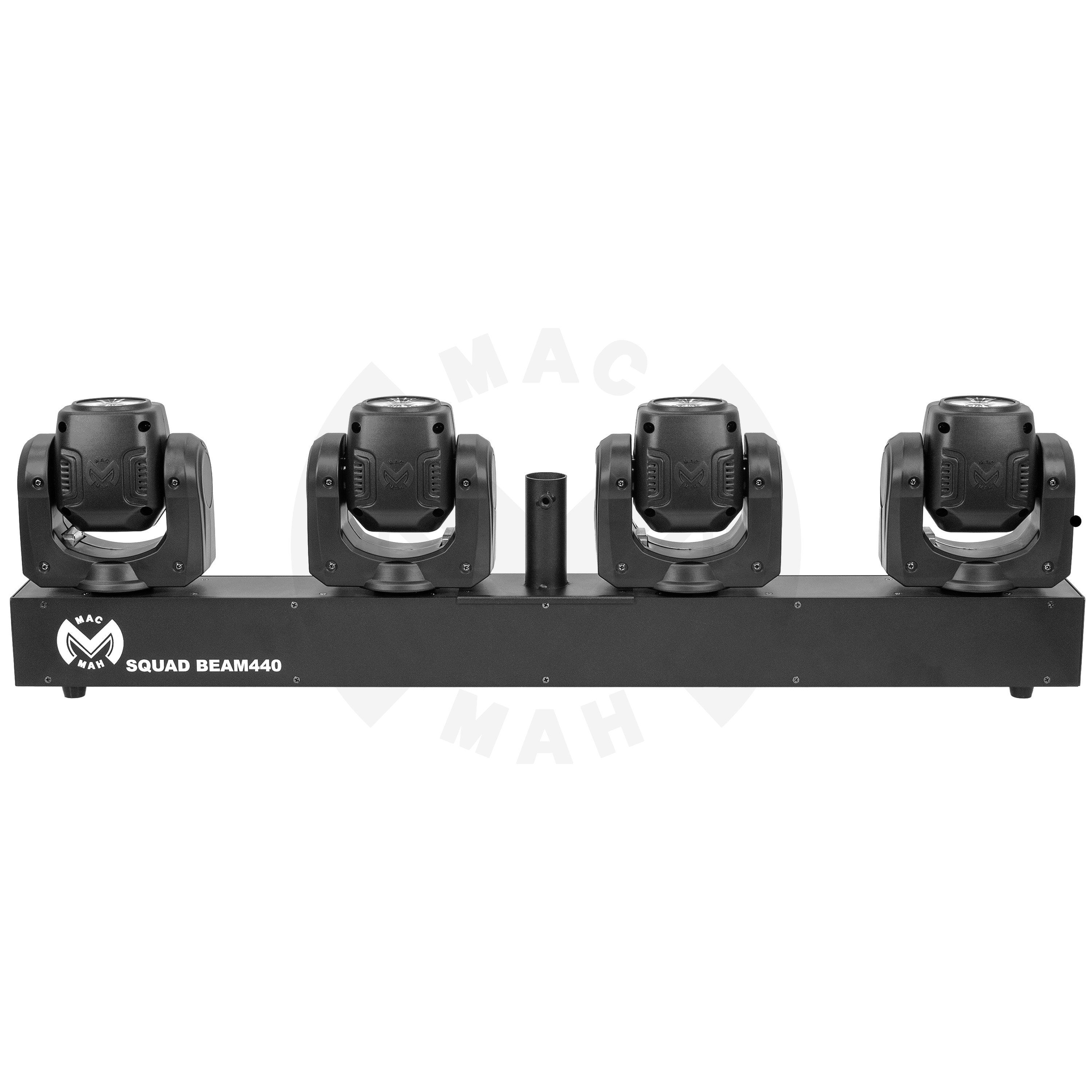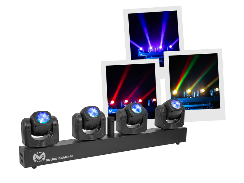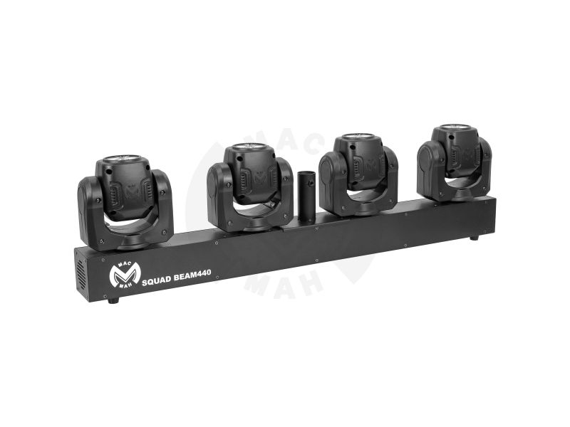 Set of 4 ultra-fast 40 W RGBW Beam LEDs with 2.5° beam angle, DMX, auto, audio. Ideal for DJs, stages and events. Powerful, precise effects, quick set-up. Mac Mah Squad Beam 440 Set of 4 ultra#fast Beam effect slave spotlights Numerous automatic...