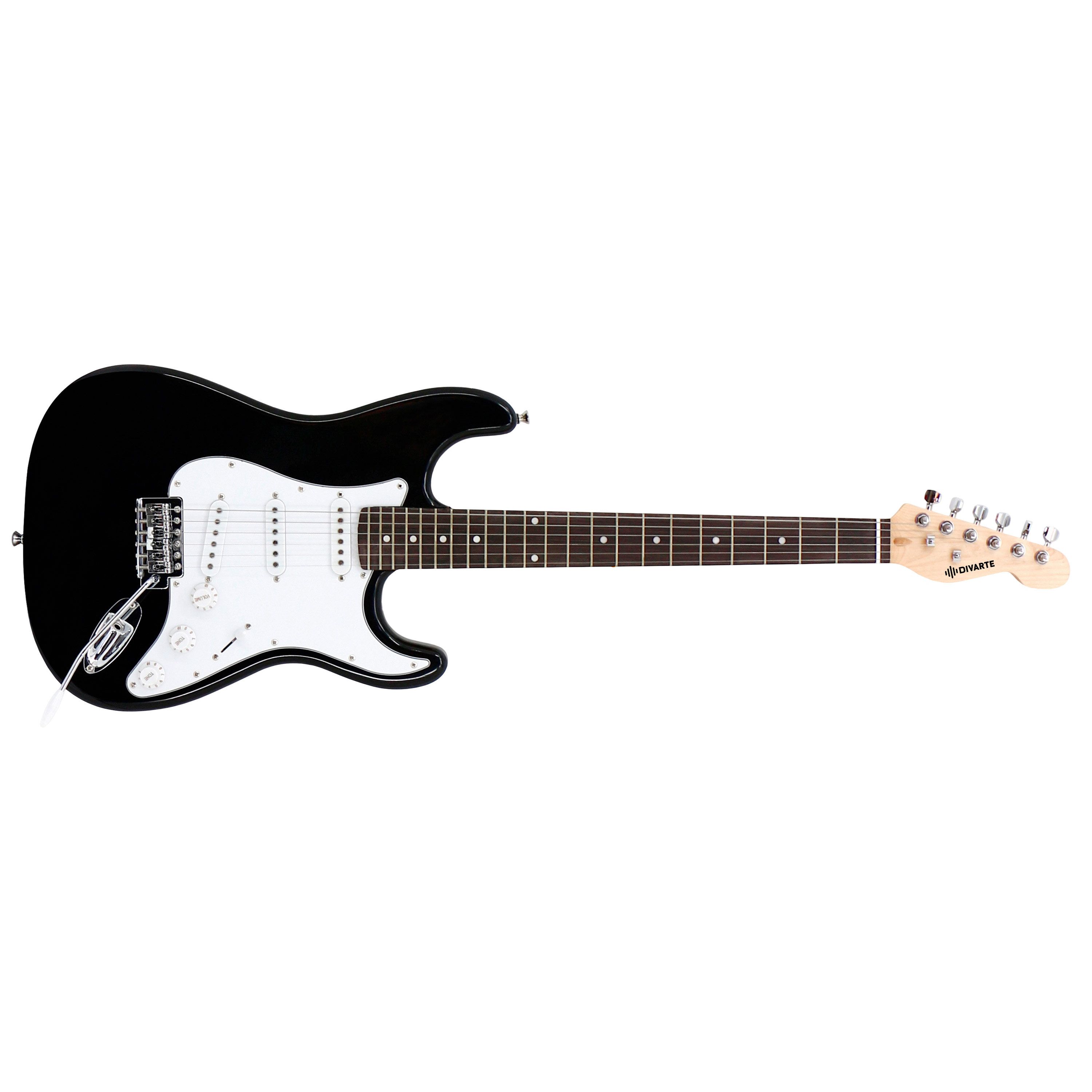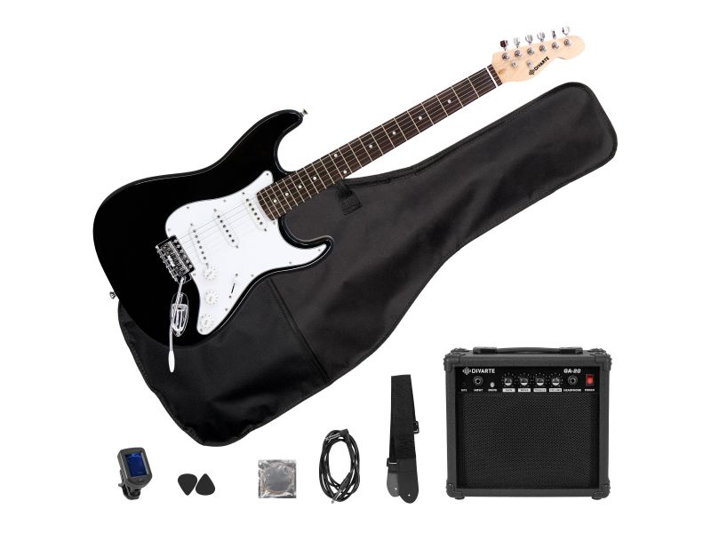 The Divarte ST Electric Black electric guitar pack has everything you need to get off to a good start. The 4/4-size guitar features an ST-style body in lightweight paulownia and a C-profile maple neck with 22-fret rosewood fingerboard. The positions are c...